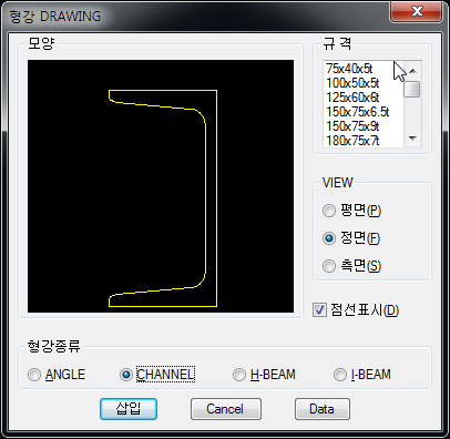 Angle, Channel, H-Beam, I-Beam을 목록에서 규격을 선택하여 작성하는 기능입니다.
