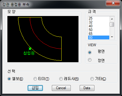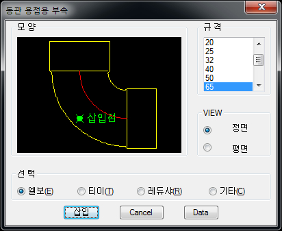 엘보, 티이,레듀샤,캡,45도엘보 피팅을 작성할수 있으며 정면도, 평면도 모양을 선택하여 작성 할 수 있습니다.