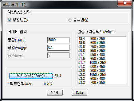 원형 덕트로 계산되어 사각덕트 크기를 선정할 수 있도록 목록으로 표시해줍니다.