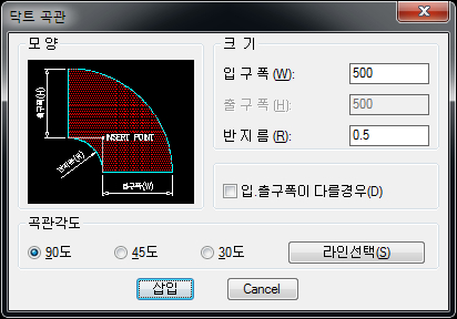 덕트의 곡관 90도,45도,30도,15도 모양으로 작성하는 기능입니다.