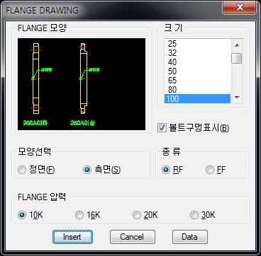 FLANGE를 평면도,측면도,압력별로 작성하는 기능입니다.